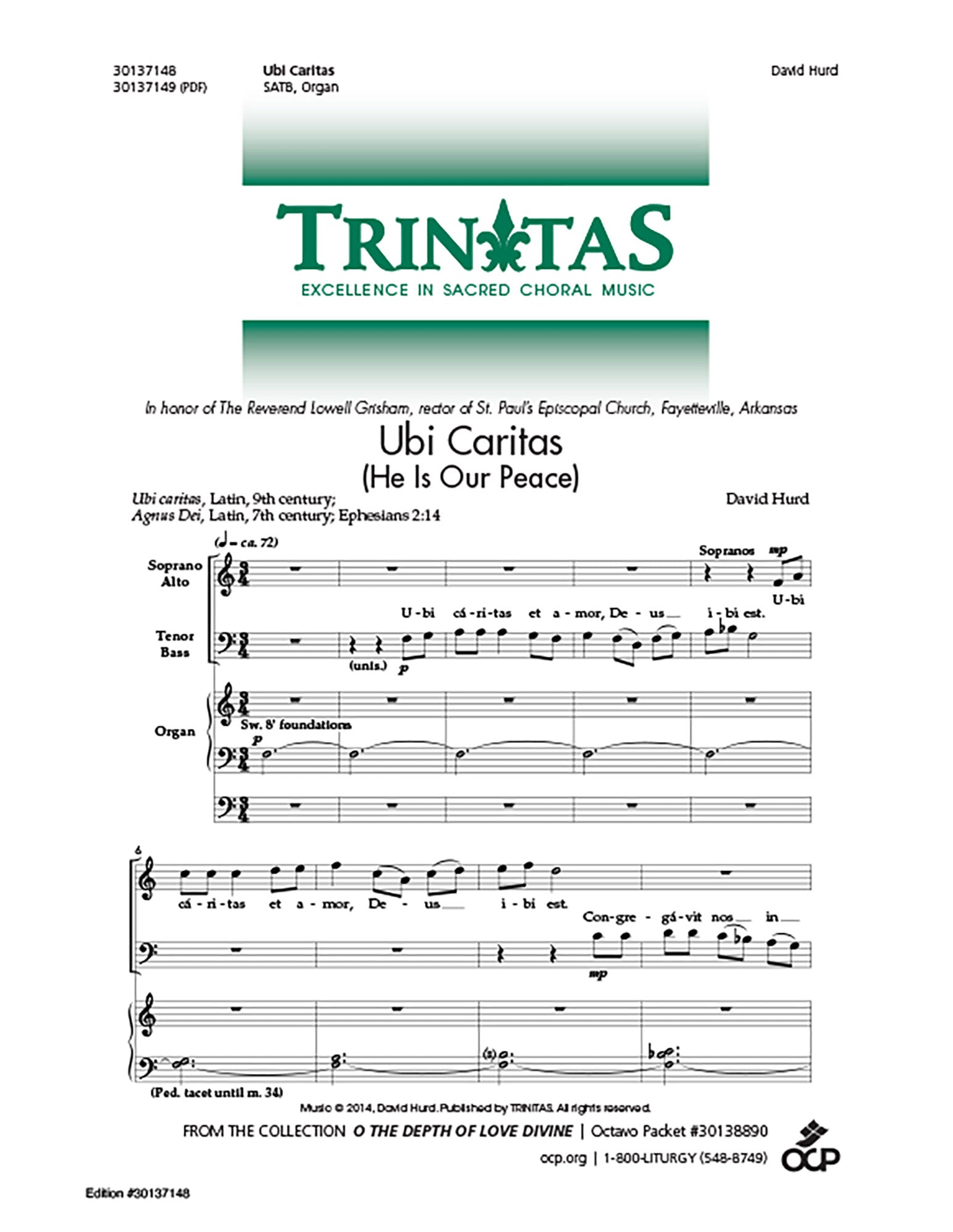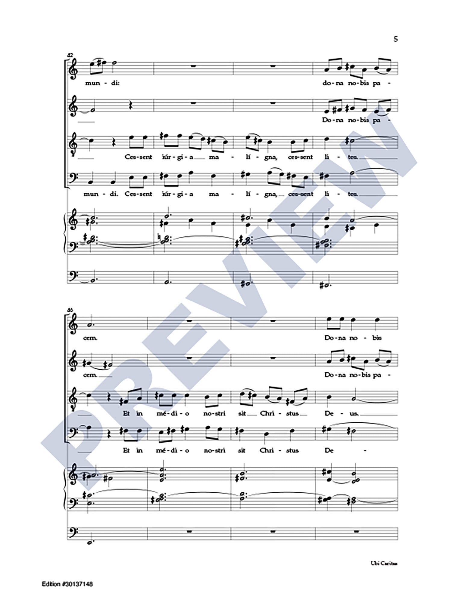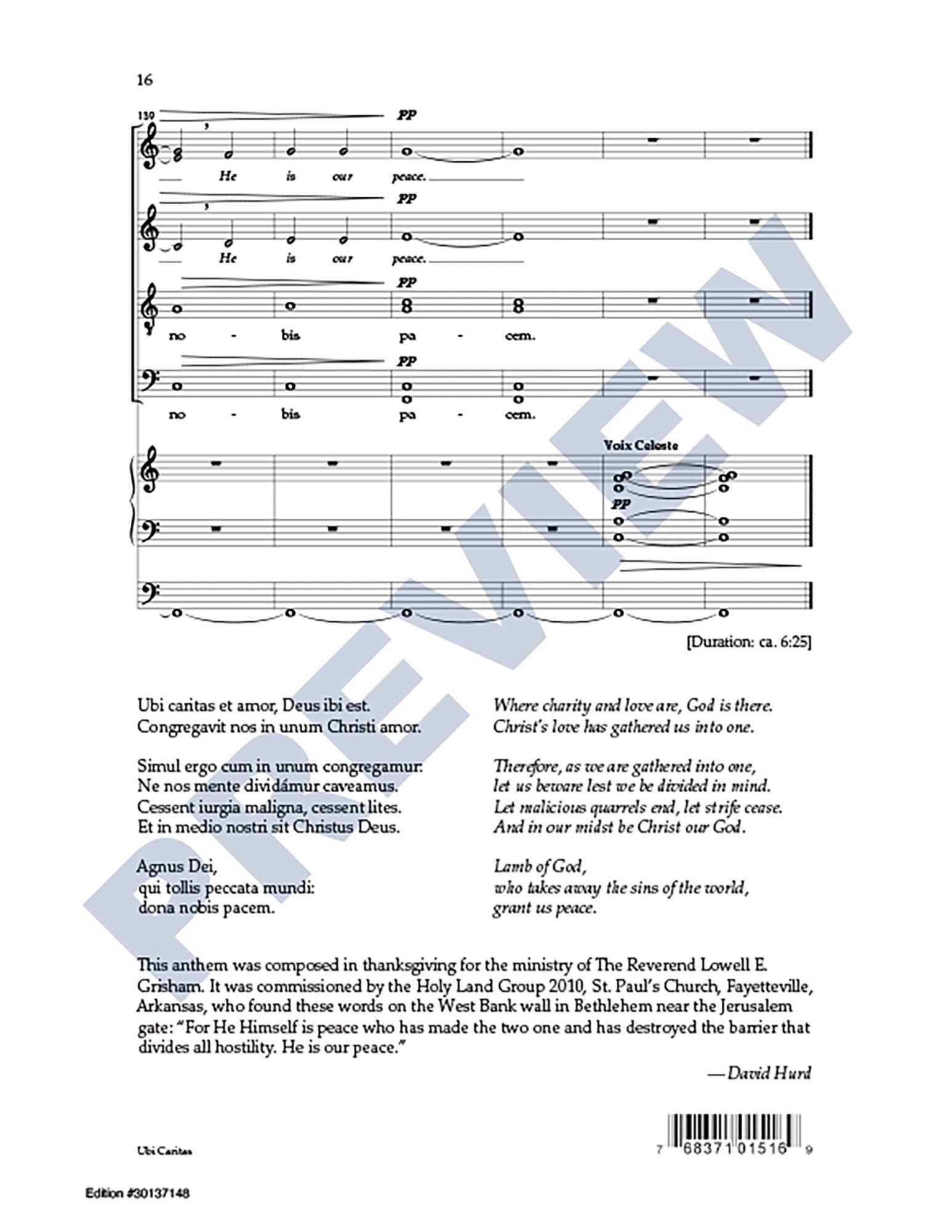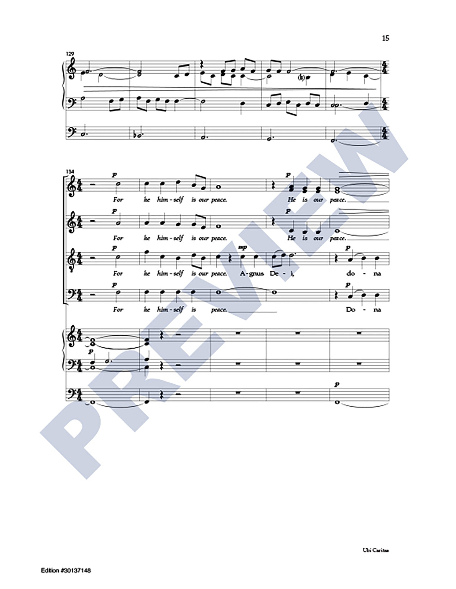 Excerpts from the Latin texts of Ubi Caritas and Agnus Dei are interwoven with a passage from Ephesians in this extended choral anthem (6:25) focusing on themes of peace and unity. For skilled SATB choir and organ.