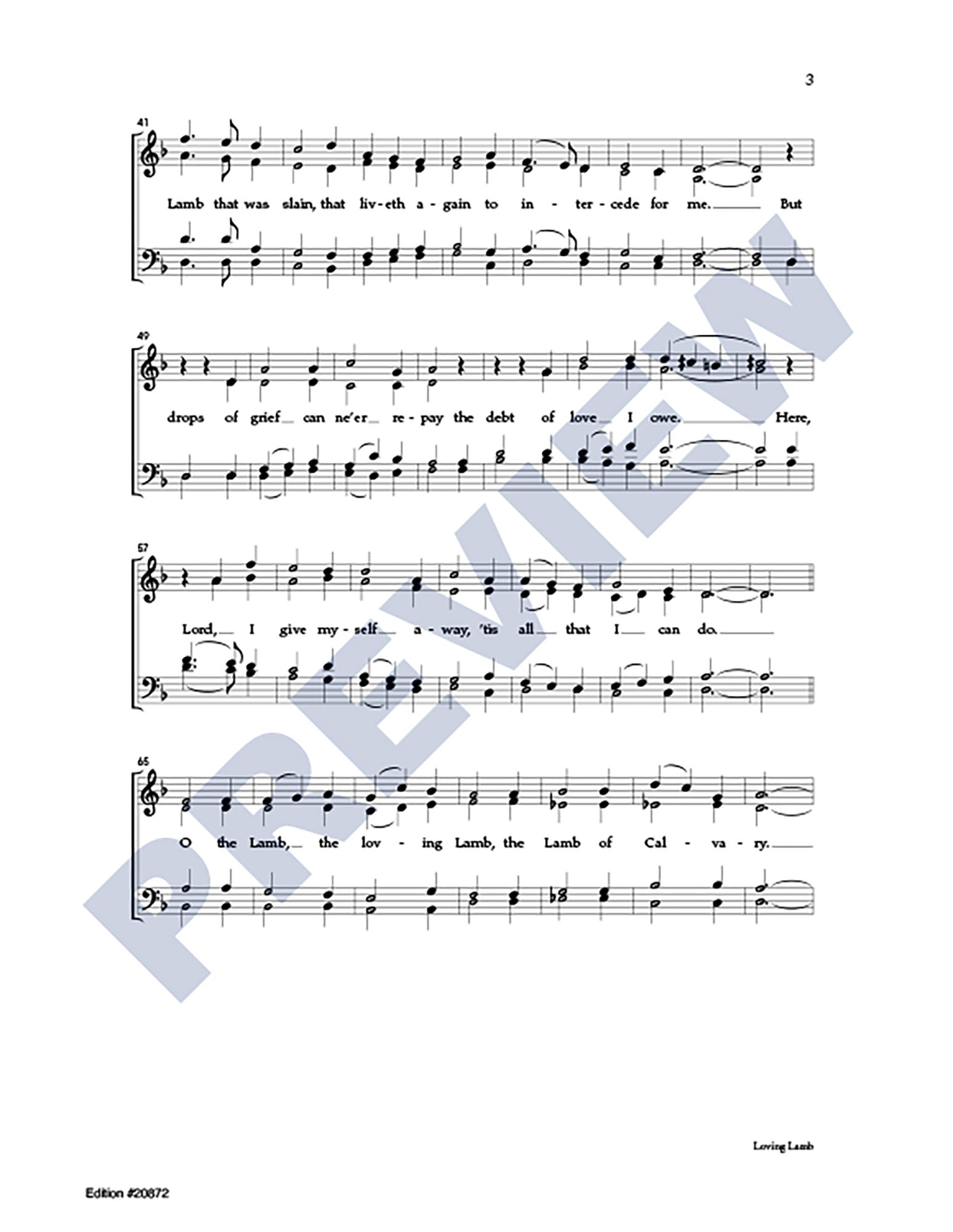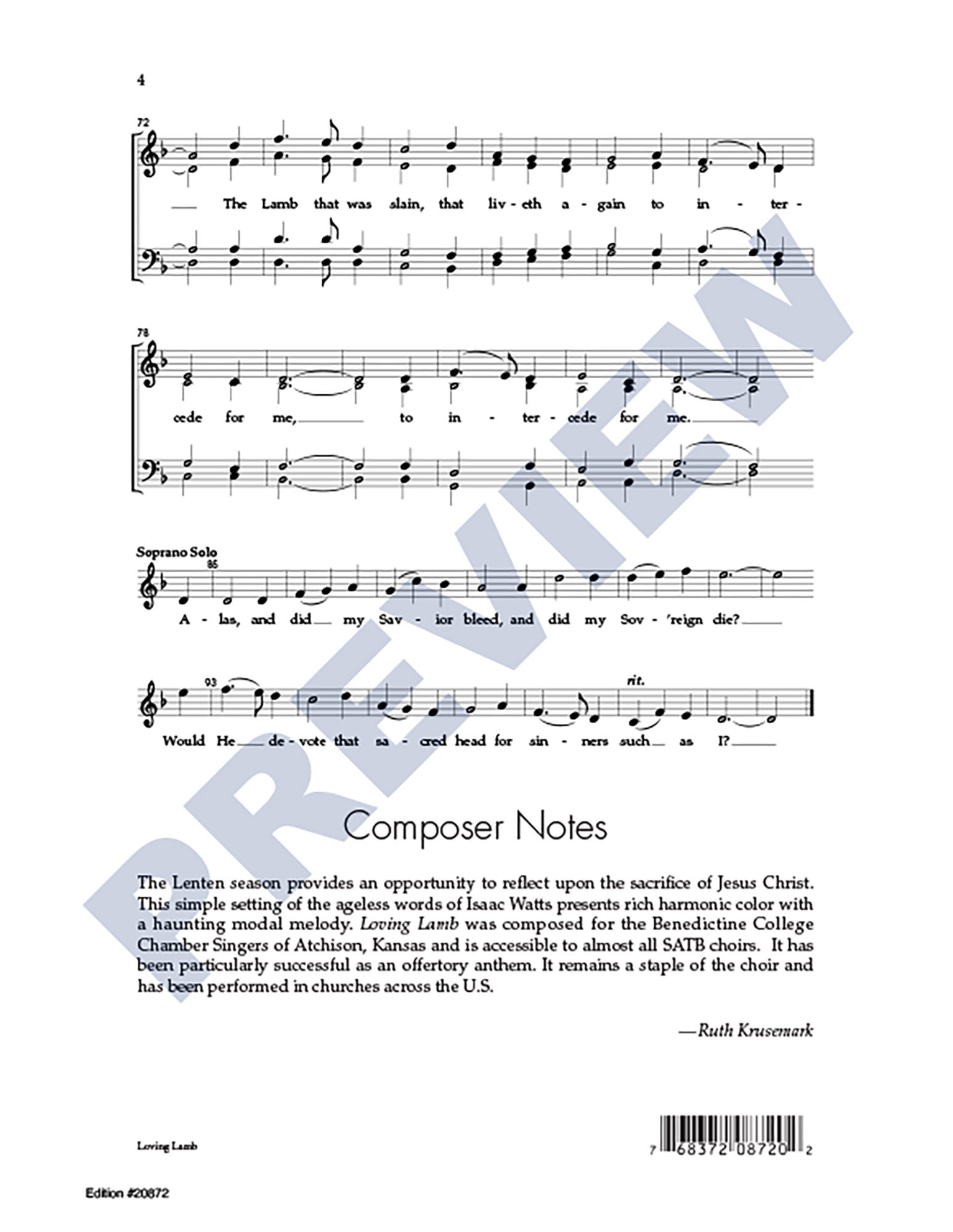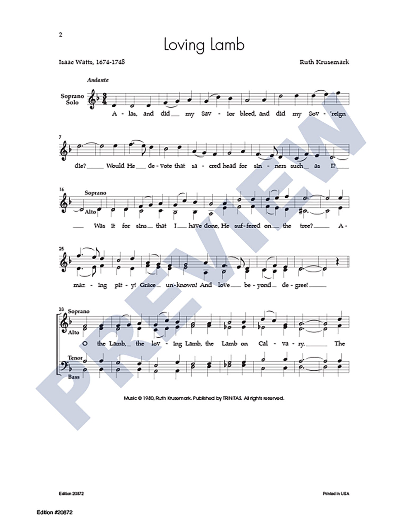 Beautiful in its austerity, "Loving Lamb" is a perfect synthesis of text and music, with rich harmonic color and a haunting modal melody. Accessible for almost all SATB choirs, the timeless words of Isaac Watts and the simple yet stunning musical setting by Ruth Krusemark will make this a staple.