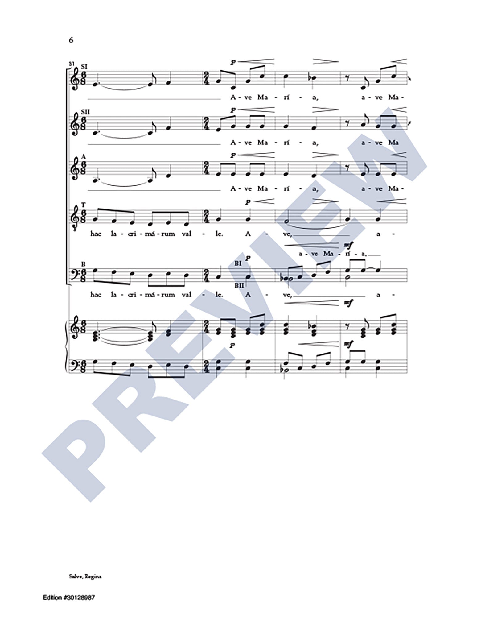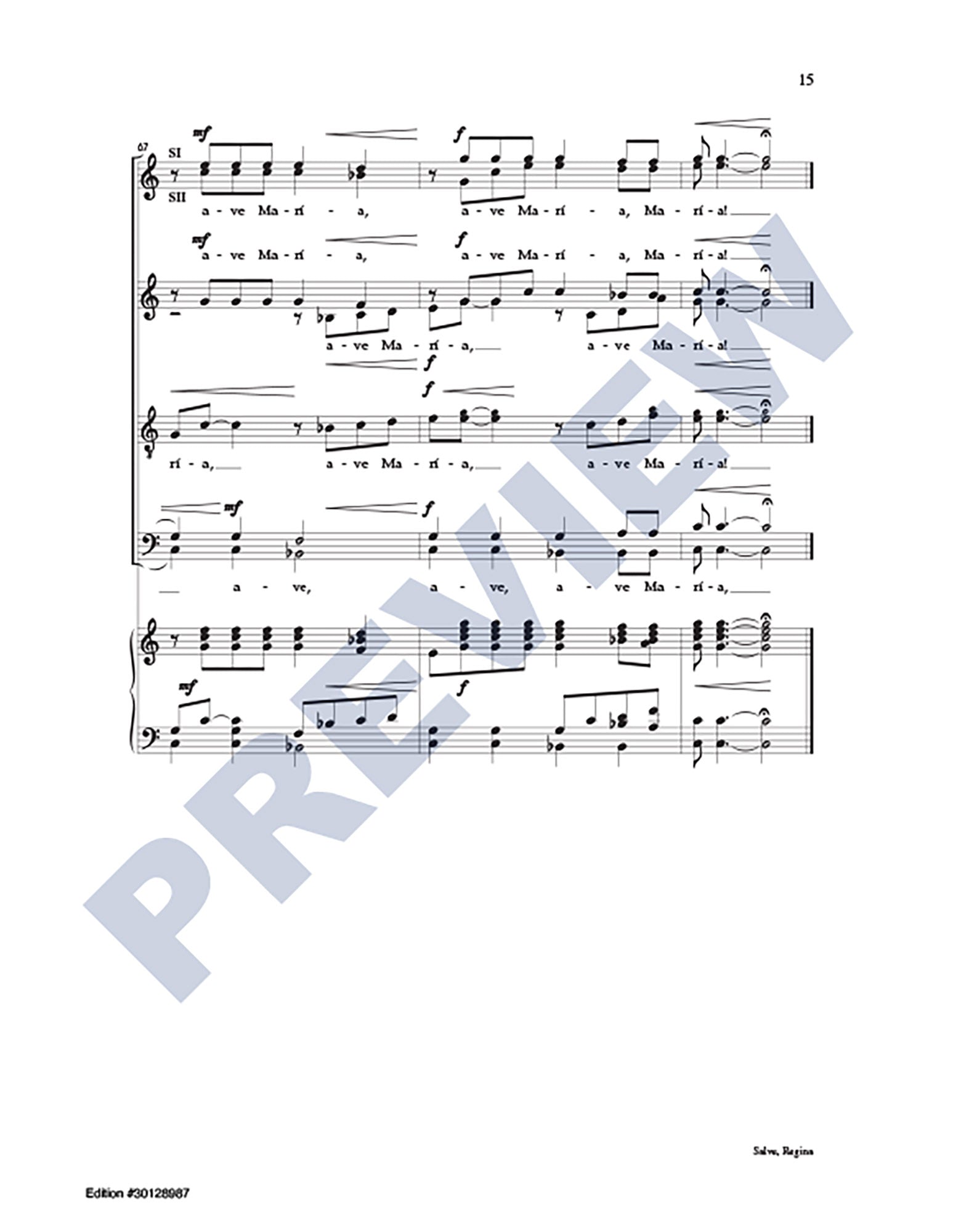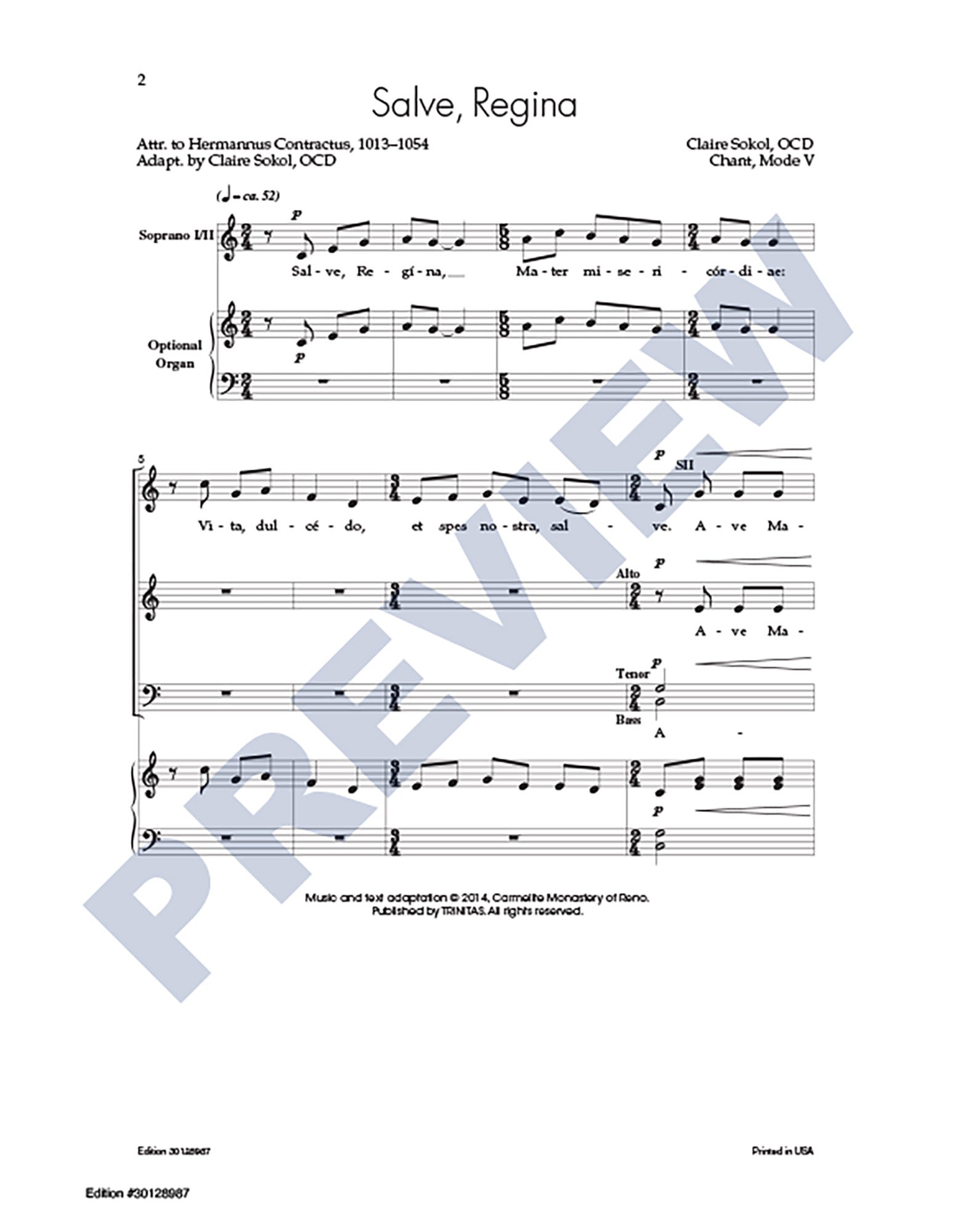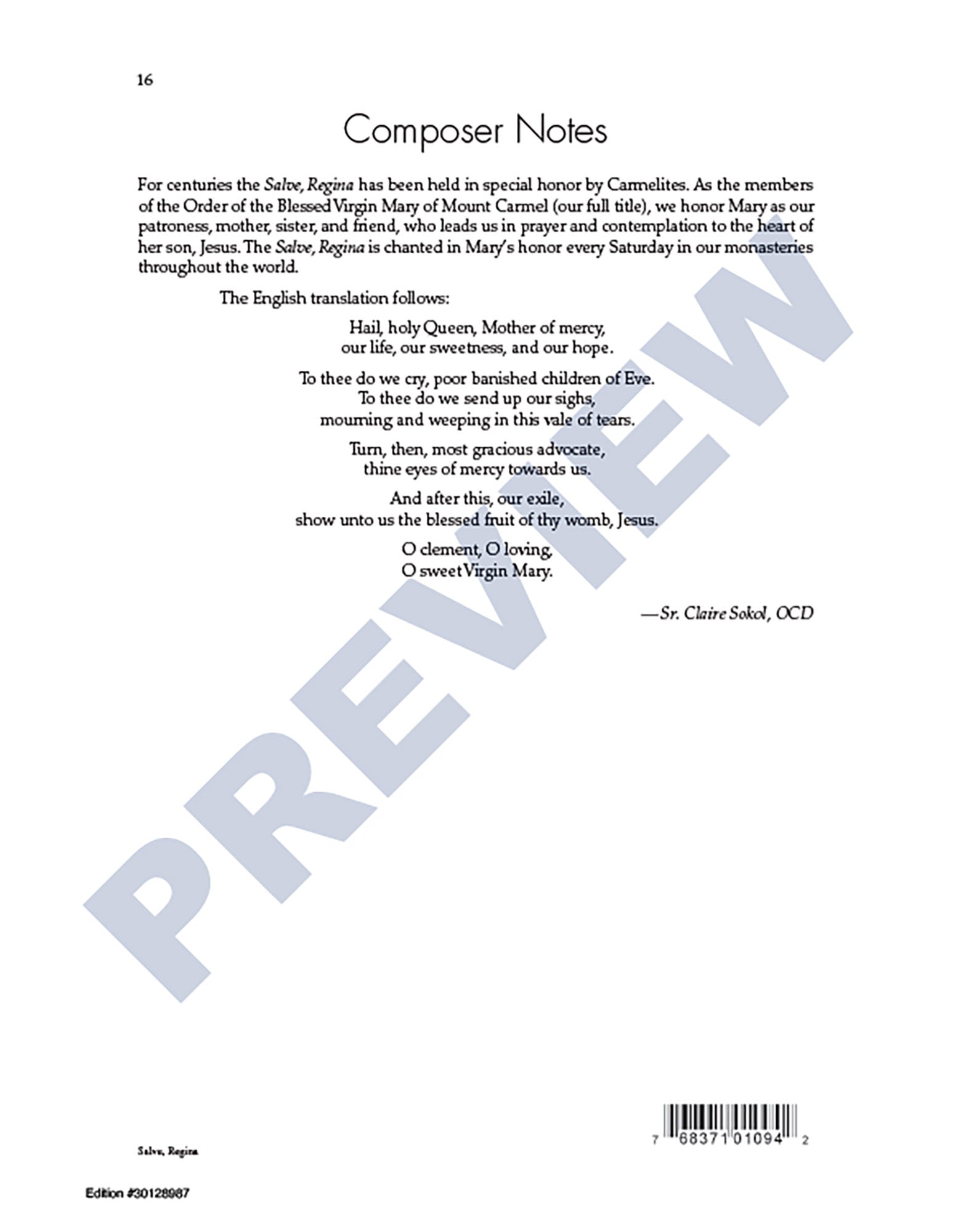 Set for large choir (SSAATBB) with an optional organ accompaniment, this is an attractive arrangement of the well-known Latin chant, which for centuries has been held in special honor by the Carmelites (Sr. Sokol's order). Modal harmonies and shifting meters to accommodate the chant rhythms give the piece a timeless feel, which builds in power and intensity from a simple unaccompanied statement of the chant at the outset, to a stirring forte conclusion sung by the full choir in seven parts.