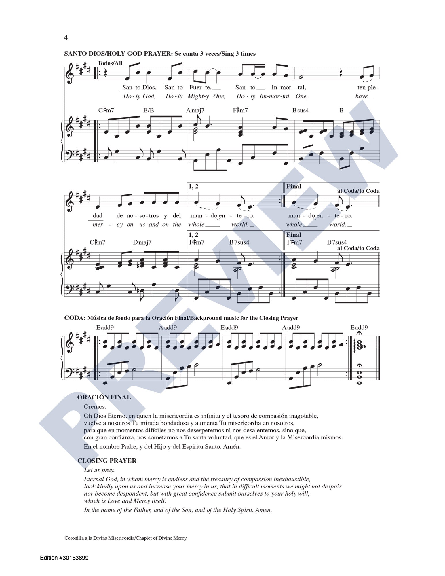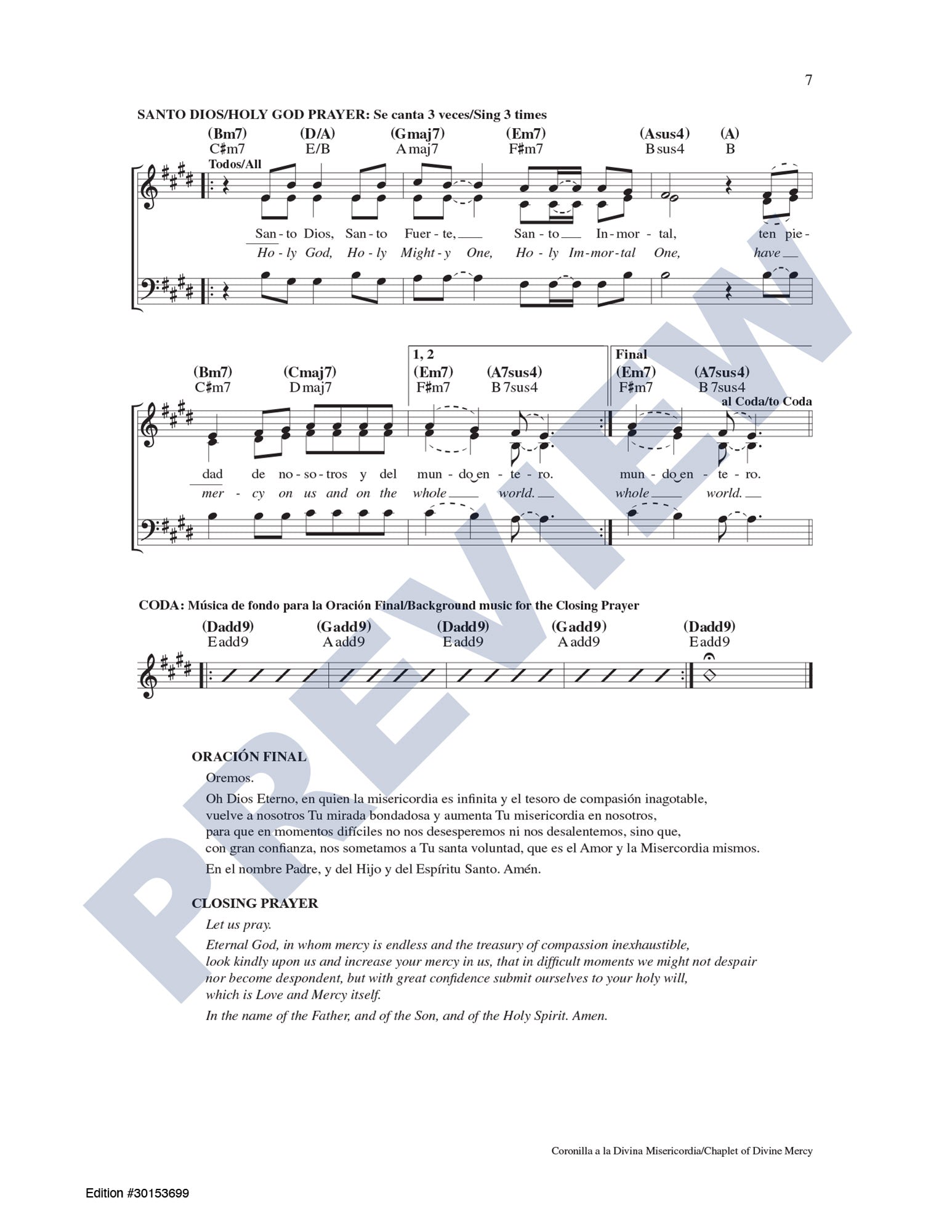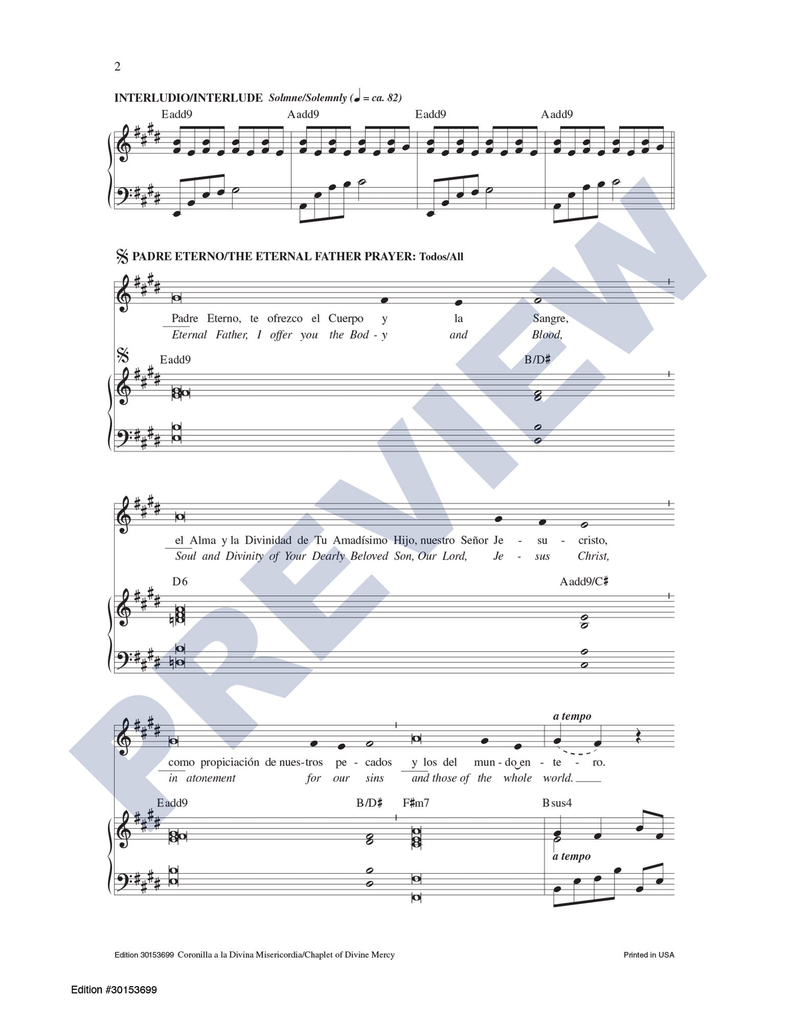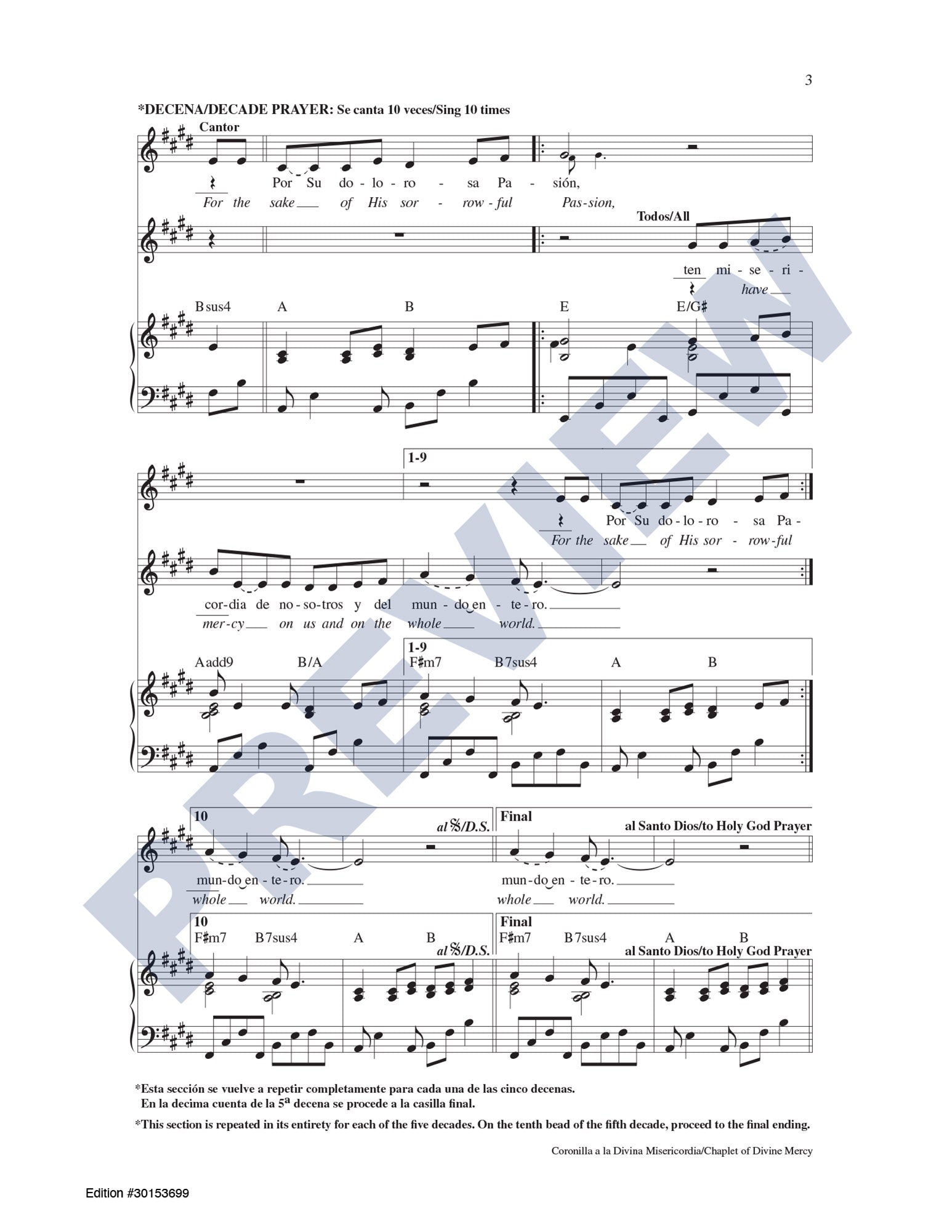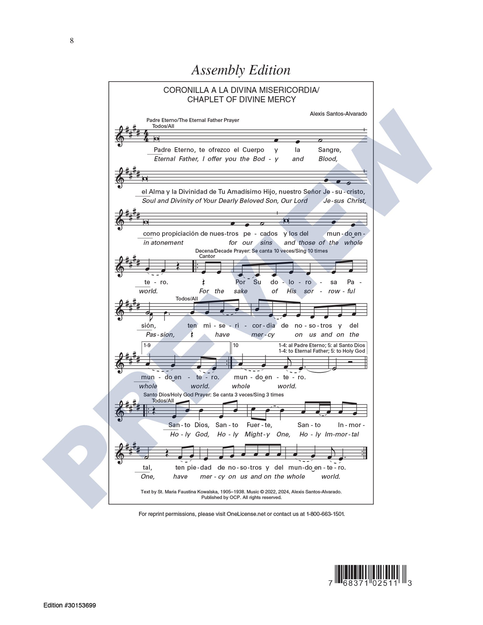 Since the canonization of St. Faustina Kowalska (1905–1938) in 2000 and the institution that same year of the Second Sunday of Easter as Divine Mercy Sunday, this devotion has only grown in popularity worldwide. Scored for SAB choir, keyboard, and guitar, this accessible musical setting provides a bilingual option for this devotion and includes the opening and closing prayers.