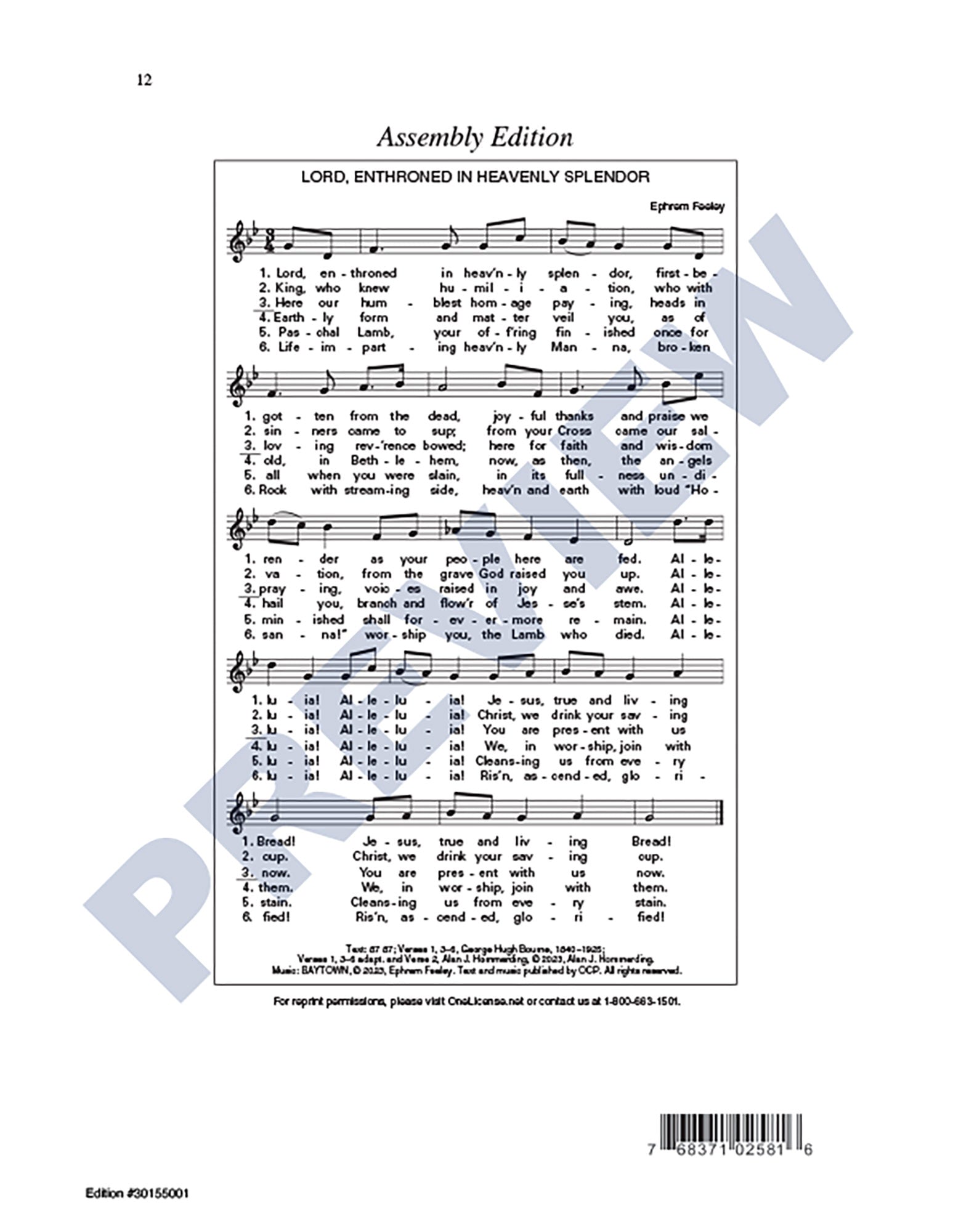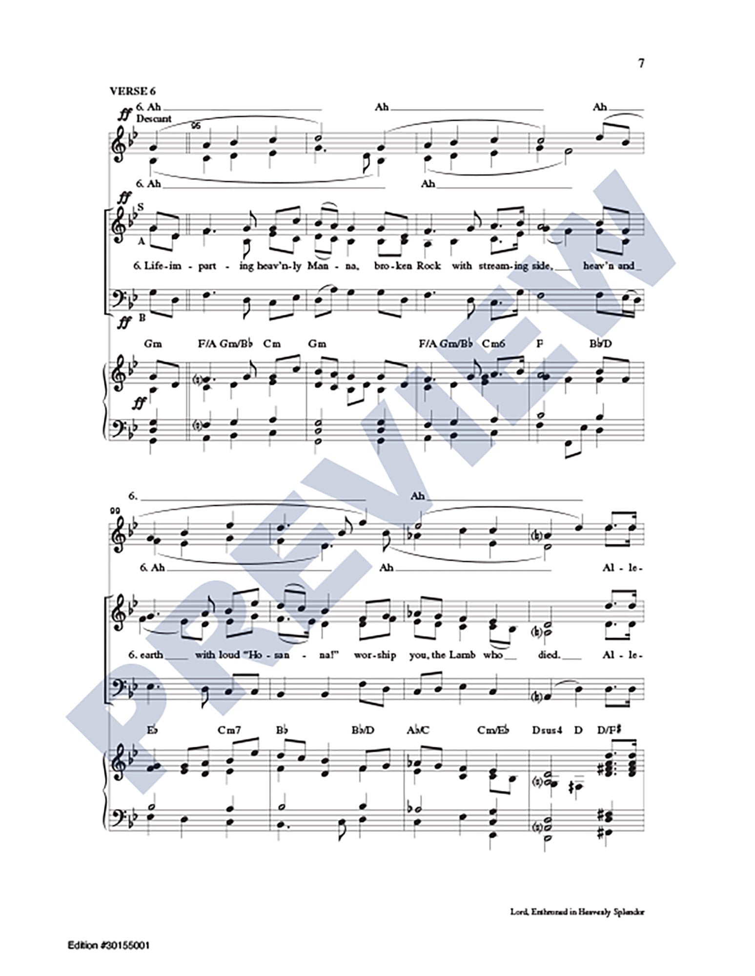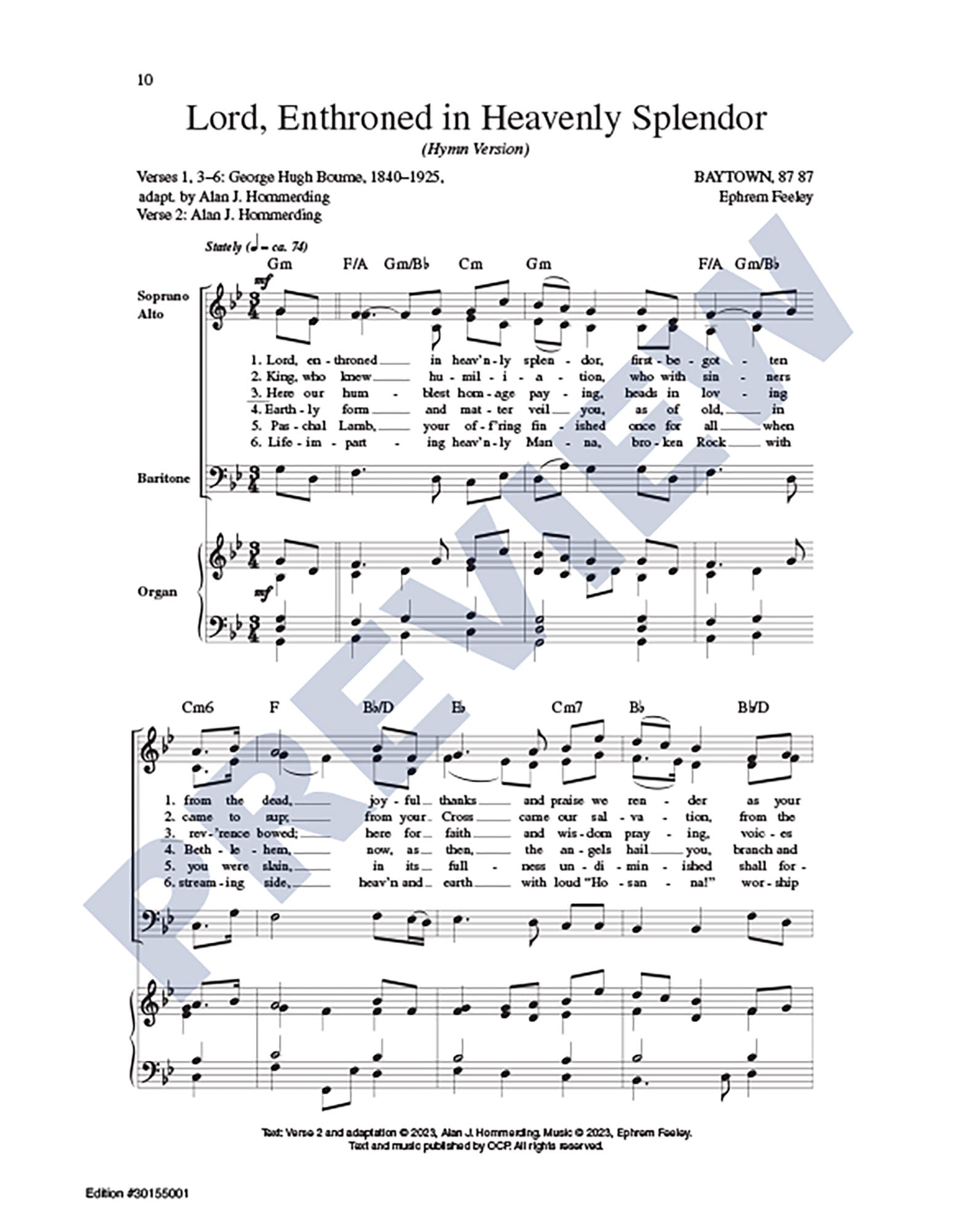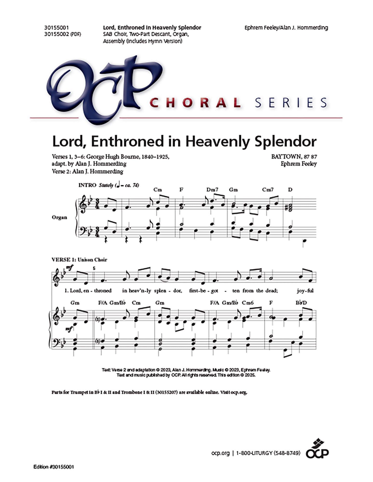 Setting Alan J. Hommerding’s new and exciting adaptation of Bourne’s well-known hymn “Lord, Enthroned in Heavenly Splendor,” this new hymn tune, BAYTOWN, written by Ephrem Feeley is joyful and dignified with plenty of musical variety throughout. The text, with topics of thanks, praise, worship, salvation, and plenty of “Hosannas” and “Alleluias” is most appropriate for the Easter season. It is scored for SAB choir, two-part descant, organ, and includes a simplified hymn version.