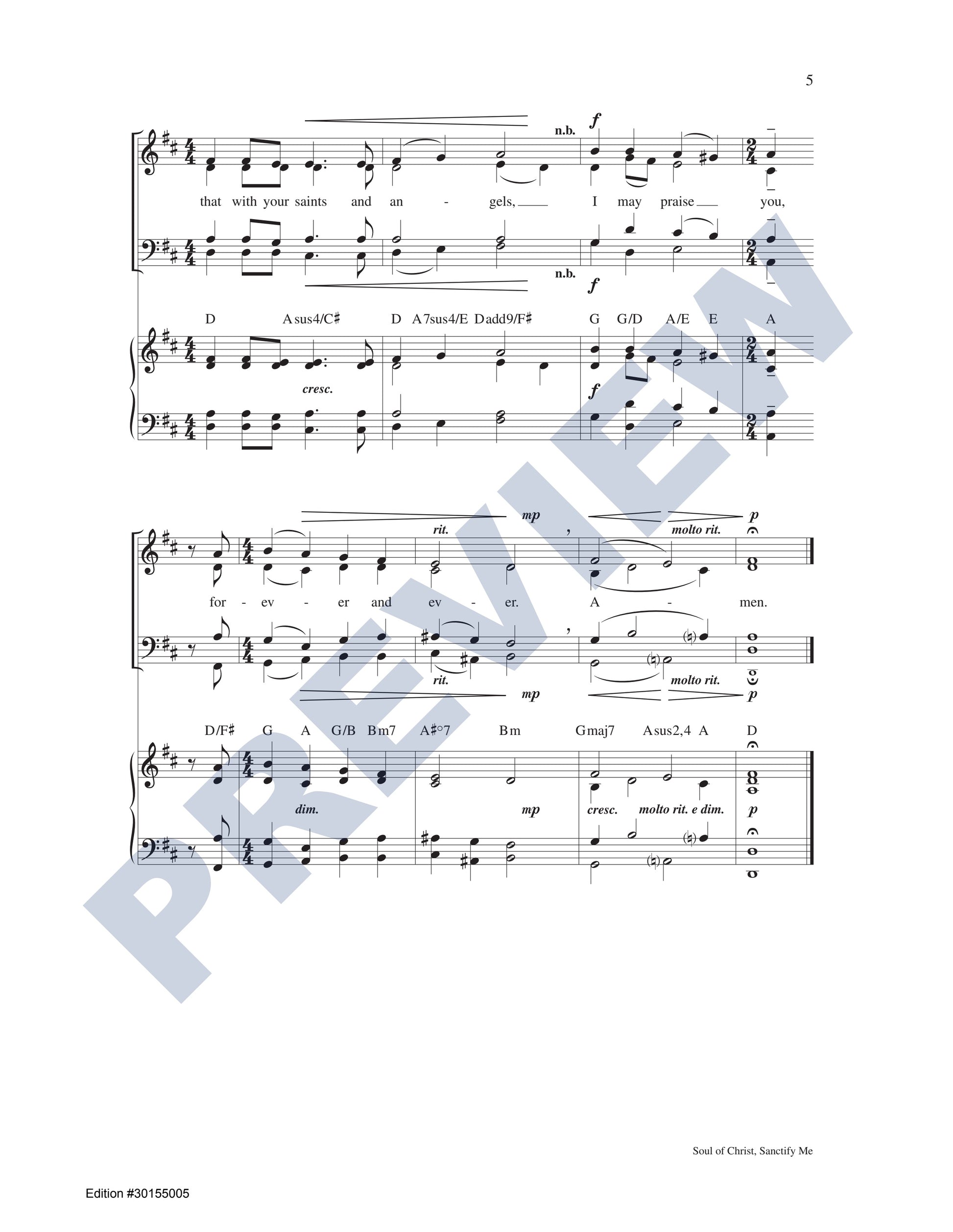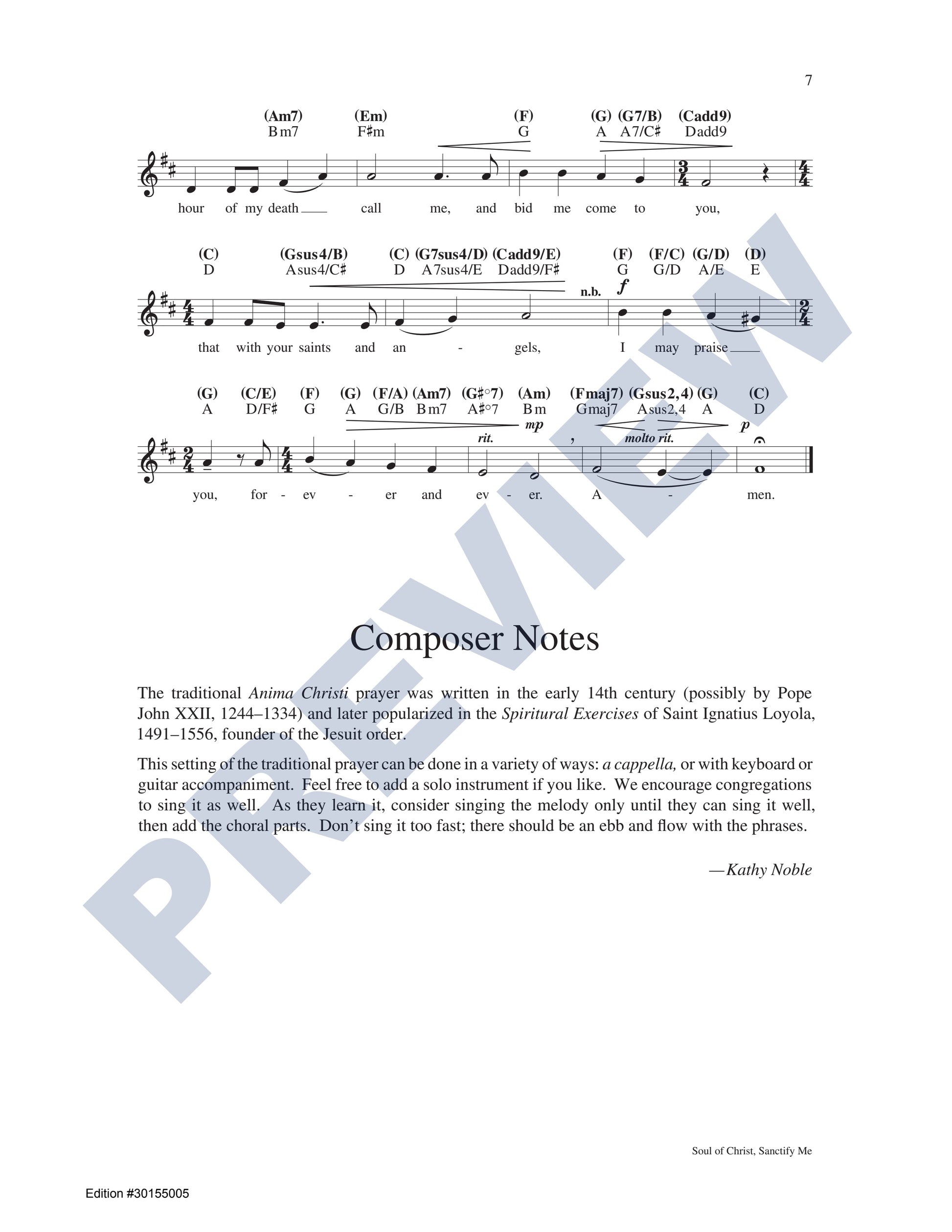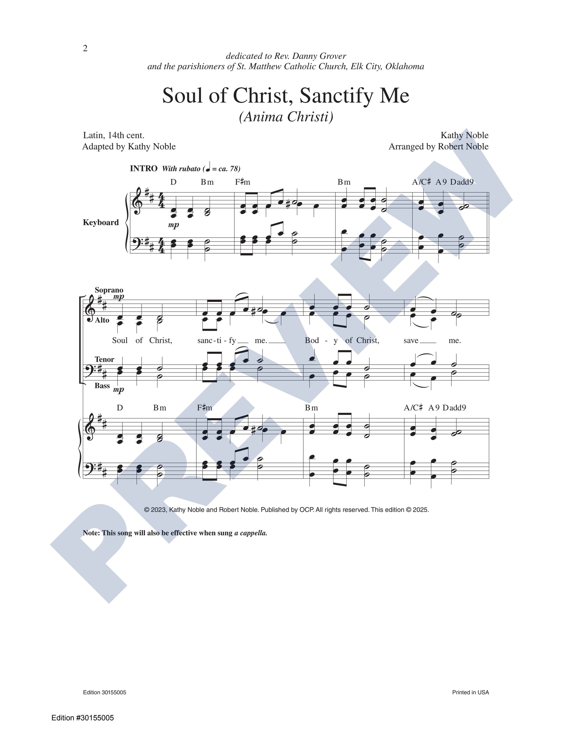This piece features an accessible and expressive setting of the beloved Anima Christi prayer, arranged for SATB choir, keyboard, guitar, and assembly. Designed with versatility in mind, it can be sung in unison, with full choral harmonies, accompanied, or a cappella. Its themes—comfort, devotion, eternal life, longing for God, petition, prayer, the suffering of Christ, water, the Eucharist, and Saints—make it a valuable and adaptable addition to any choral repertoire.