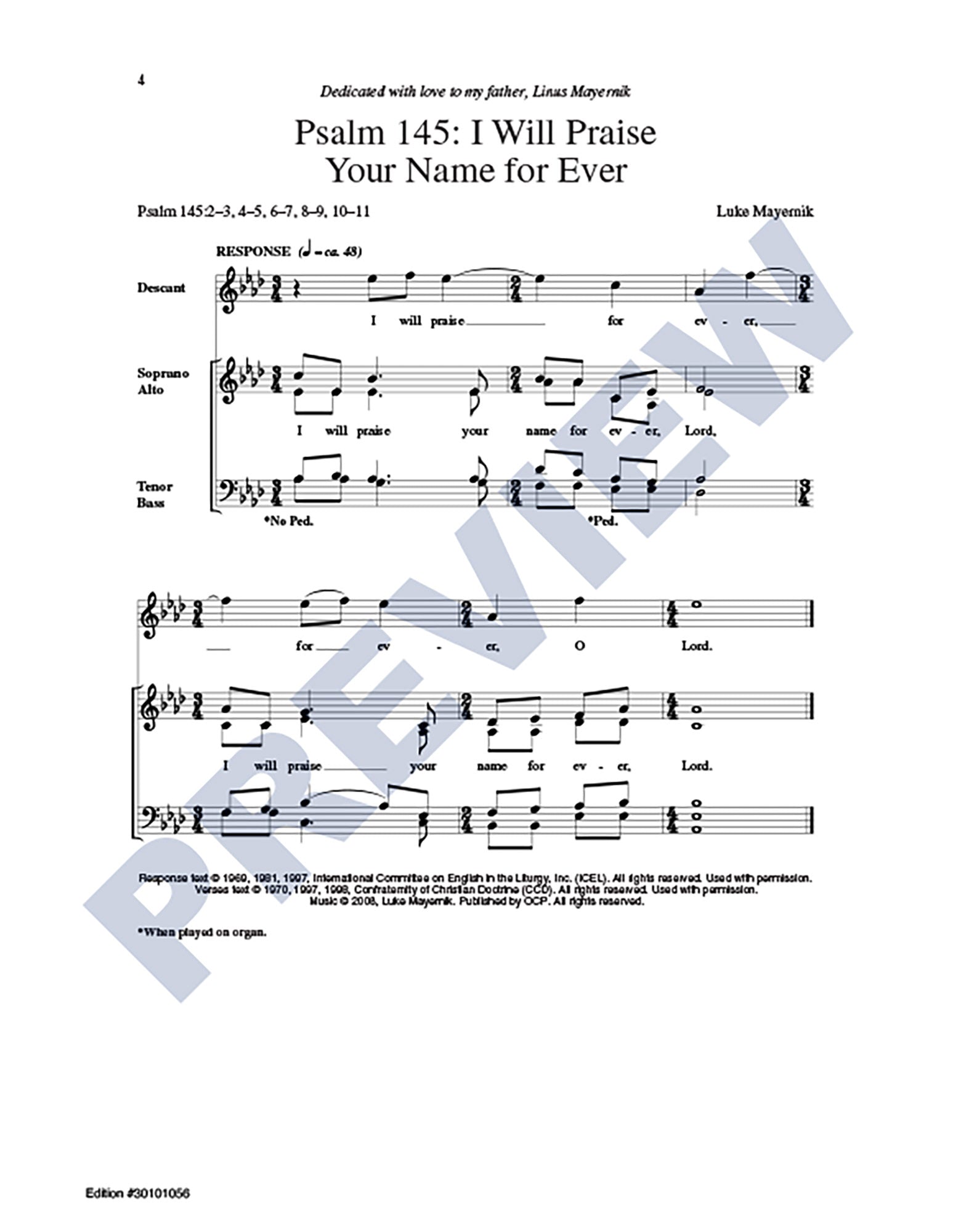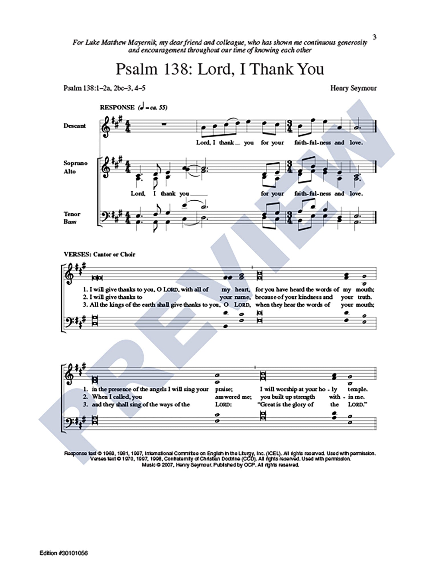 The harmonic language of this collection of Psalms for use on Thanksgiving Day— straightforward, with a tasteful use of mild dissonance— is sure to make them a perennial favorite. The metered SATB responses wonderfully complement the chanted verses that may sung by either a cantor or SATB choir.