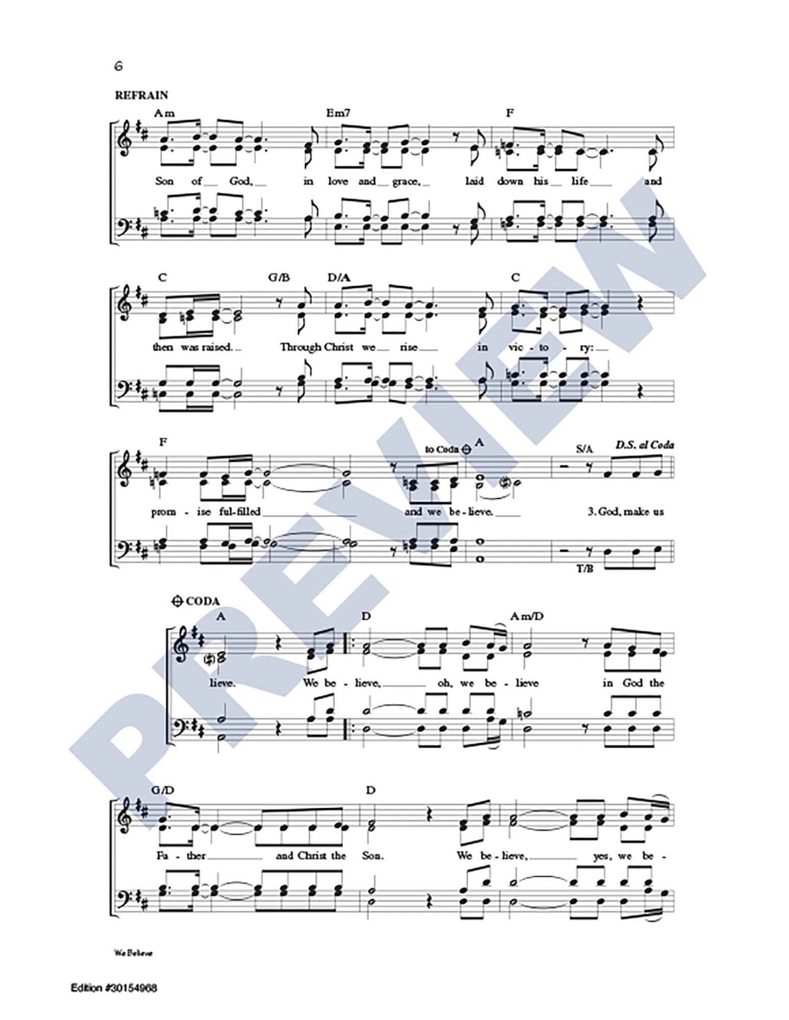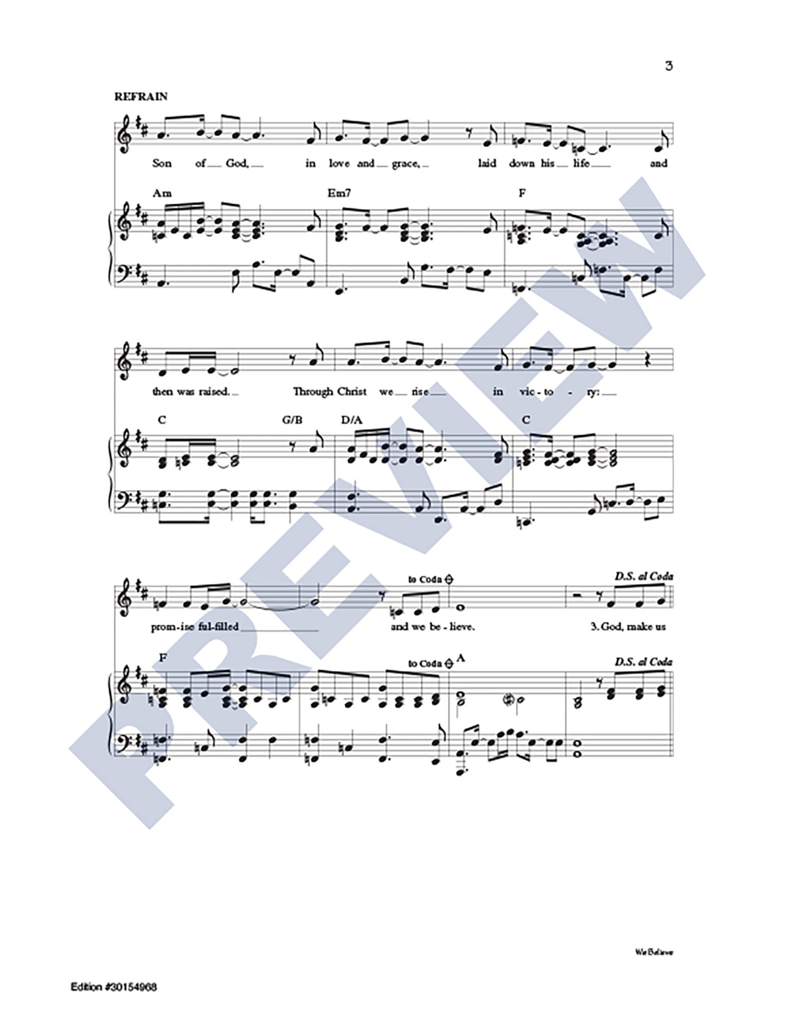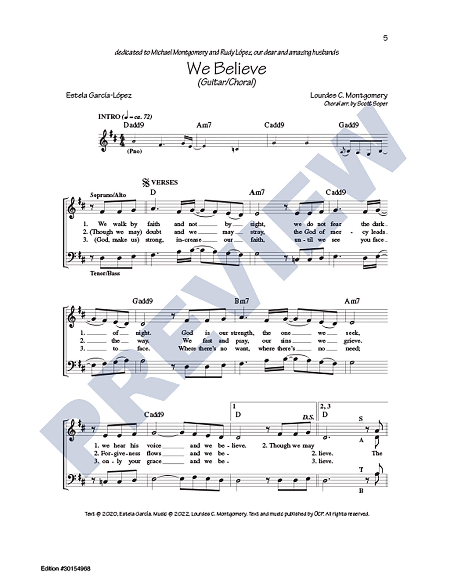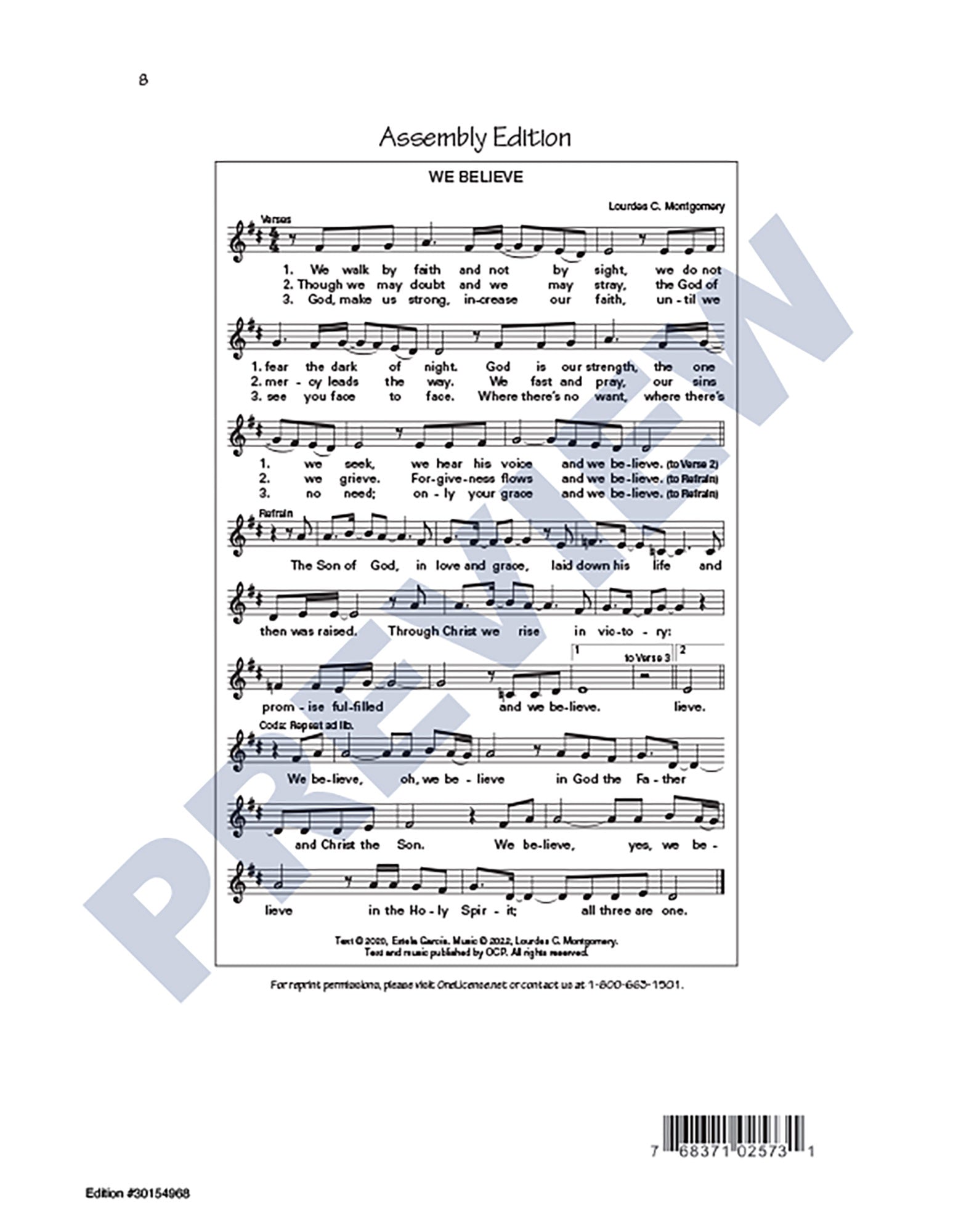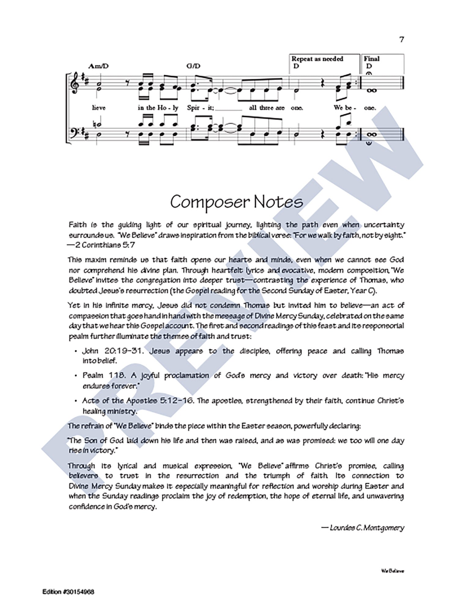 With its lyrical, gently syncopated melody, “We Believe” proclaims Christ’s promise and invites believers to place their trust in the resurrection and the victory of faith. Especially suited for Divine Mercy Sunday, this piece offers opportunities for reflection and worship throughout the Easter season and in liturgies focused on Christian life, discipleship, and faith. It is appropriate for ensembles of easy-to-medium skill level and is scored for SATB choir, piano, guitar, and assembly. String parts are available as a separate downloadable manuscript at ocp.org.